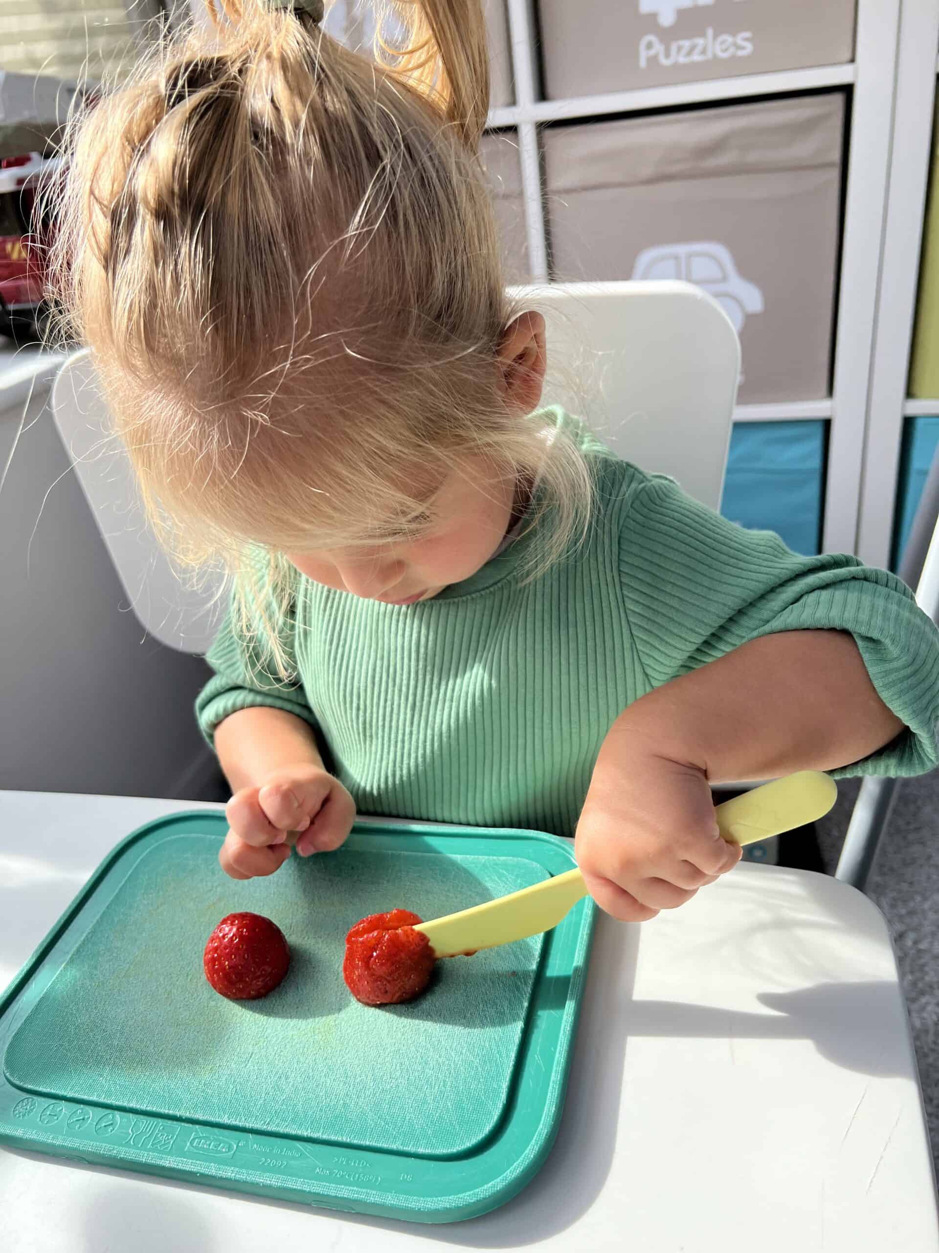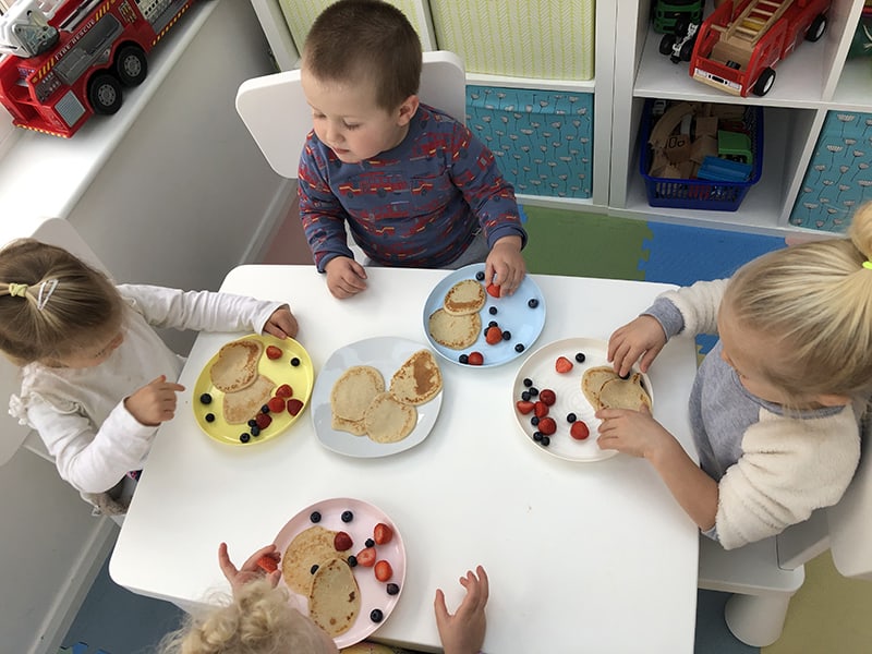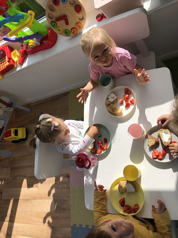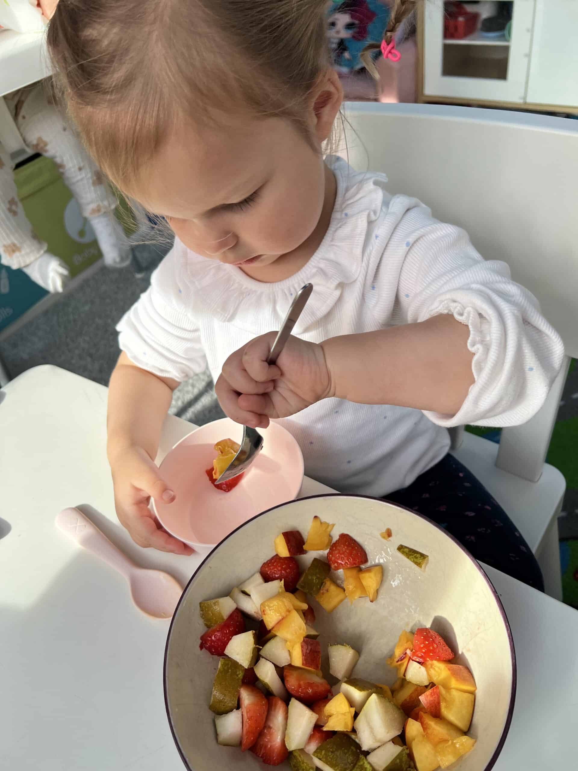 Mealtimes give many opportunities for children to develop their skills. Children strengthen their fine and gross motor skills by manipulating cutlery, which will help them with their writing skills in the future (physical development). Mealtimes provide an excellent social situation. Offering food and drink to the children gives plenty of opportunity for children to use their manners, take part in conversations and express their thoughts and feelings (personal, social and emotional skills). Language development can be fully supported at the dinner table, building vocabulary and encouraging children to use their language to make requests or comments (communication and language). The food offered at mealtimes can support children in thinking about the world. Children get a chance to learn where different foods come from and compare mealtime traditions in their homes as well as in various countries and cultures (understanding of the world).